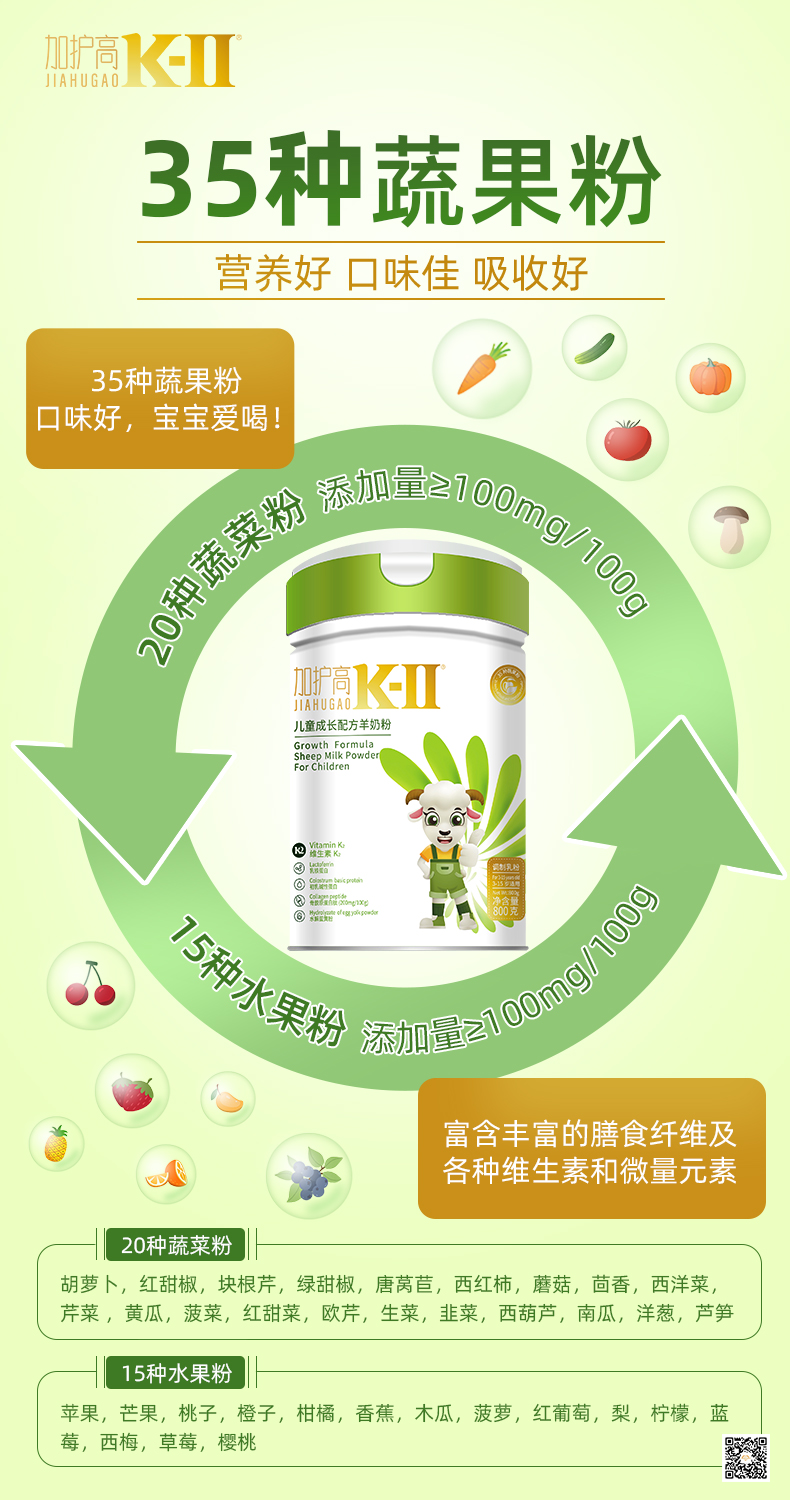 果蔬粉是高含量的蔬菜水果营养,富含丰富的膳食纤维及各种维生素和微量元素。加护高K-II在奶粉中添加35种果蔬粉,不仅提高了奶粉的营养成分,改善了奶粉的口味,同时保护宝宝肠道健康,促进营养物质消化、吸收。